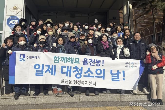 (중앙뉴스타임스 = 방재영 기자) 수원시 장안구 율천동 행정복지센터는 지난 6일 민족 최대의 명절인 설 연휴를 대비하여 통장협의회 및 직원 등 60여 명이 함께 참여하여 설맞이 일제 대청소를 실시했다.