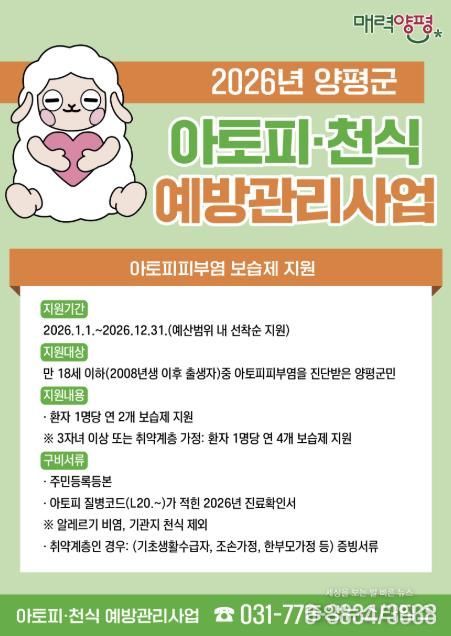 (중앙뉴스타임스 = 방재영 기자) 양평군은 지역사회 중심의 알레르기질환 조기 발견과 적절한 치료를 위해 양평군민을 대상으로 2026년 연중 ‘아토피피부염 보습제 지원’과 ‘취약계층 알레르기질환 의료비 지원’ 사업을 추진한다고 밝혔다.