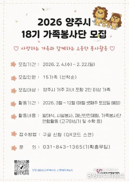 (중앙뉴스타임스 = 방재영 기자) 양주시자원봉사센터는 가족이 함께 참여하는 자원봉사 활동을 통해 건강한 가족문화를 조성하고 지역사회 나눔을 실천하기 위해 가족 단위로 함께 참여하는 ‘18기 가족봉사단’을 모집한다고 9일 밝혔다.