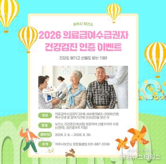 (중앙뉴스타임스 = 방재영 기자) 여주시보건소 건강증진과는 의료급여수급권자의 건강을 지키고 심뇌혈관질환을 예방하기 위해 오는 6월 30일까지 건강검진을 완료한 분들을 대상으로 ‘건강꾸러미 제공 이벤트’를 진행한다고 9일 밝혔다.
