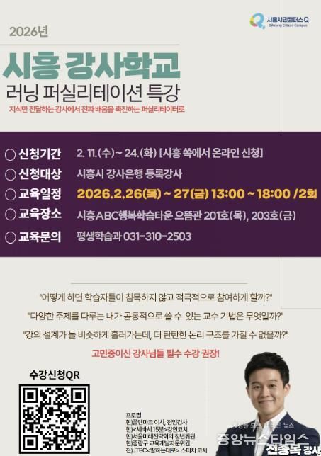 (중앙뉴스타임스 = 방재영 기자) 시흥시는 오는 26~27일까지 시흥ABC행복학습타운에서 강사들의 교수법 혁신을 위한 ‘2026년 시흥 강사학교: 러닝 퍼실리테이션 특강’을 운영한다고 10일 밝혔다.