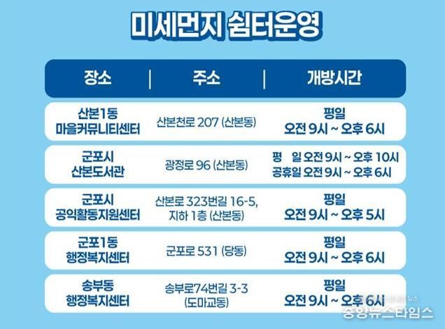 현재 운영 중인 미세먼지 쉼터는 ▲산본1동 마을커뮤니티센터 ▲산본도서관 ▲군포시 공익활동지원센터 ▲군포1동 행정복지센터 ▲송부동 행정복지센터 등 총 5개소이며, 이용 시간은 평일 오전 9시부터 오후 6시까지다. 다만, 시설별 세부 운영 시간은 각 쉼터에 문의하면 된다.