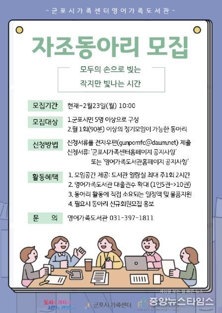 (중앙뉴스타임스 = 방재영 기자) 군포시가족센터 영어가족도서관(관장 박성희)에서 2026년 자조동아리를 모집한다고 11일 밝혔다.