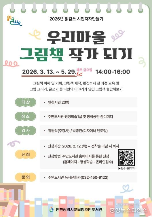 (중앙뉴스타임스 = 방재영 기자) 인천광역시교육청주안도서관은 읽걷쓰 시민저자 양성을 위한 ‘우리마을 그림책 작가 되기’ 프로그램 참여자를 모집한다.