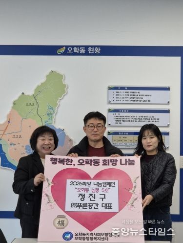 (중앙뉴스타임스 = 방재영 기자) 여주시 오학동은 ㈜푸른공간 정진구 대표가 지난 10일 오학동 행정복지센터를 방문해 이웃돕기 성금 50만 원을 기탁했다고 밝혔다.