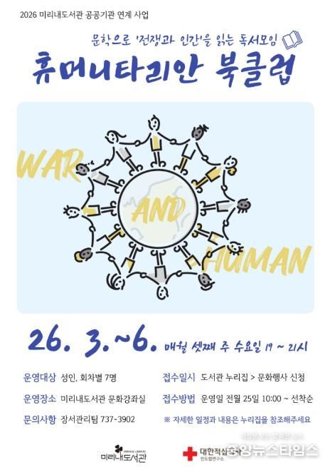 (중앙뉴스타임스 = 방재영 기자) 원주시 미리내도서관은 지역사회 내 독서 문화 확산을 위해 대한적십자사 인도법연구소와 연계한 재능 기부 프로그램 ‘휴머니타리안 북클럽’을 운영한다고 12일 밝혔다.