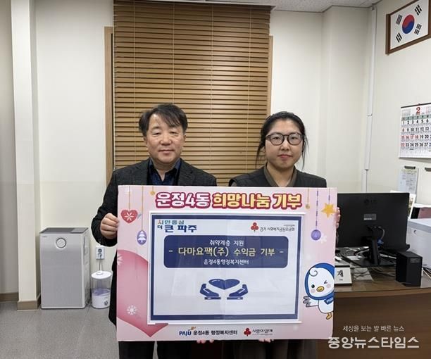 (중앙뉴스타임스 = 방재영 기자) 파주시 운정4동은 설 명절을 맞아 지난 10일 파주시 관내 중소기업인 다마요팩㈜으로부터 취약계층을 위한 이웃 돕기 성금을 기탁 받았다고 밝혔다.
