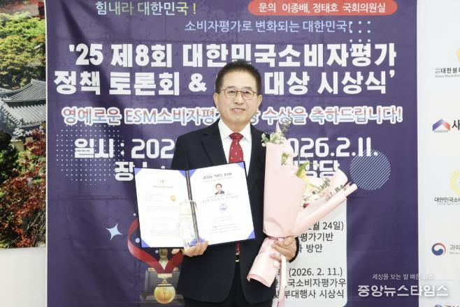 (중앙뉴스타임스 = 방재영 기자) 지난 11일, 국회 도서관에서 열린 2026 제8회 ESM대한민국소비자평가우수대상 정책토론회 및 시상식에서 광주시의회 허경행 의장이 지방자치/행정 부문 대상을 수상했다.