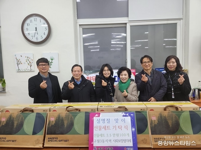 (중앙뉴스타임스 = 방재영 기자) 인천 남동구 구월3동 지역사회보장협의체(민간위원장 주영미)는 설을 맞아 취약계층 100세대에 선물 세트를 전달했다고 12일 전했다.