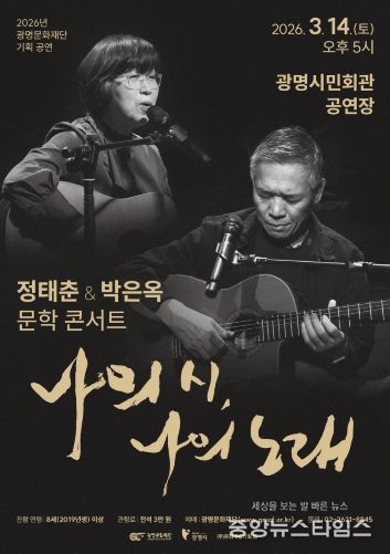 (중앙뉴스타임스 = 이광운 기자) (재)광명문화재단은 오는 3월 14일 오후 5시 광명시민회관 공연장에서 한국 포크 음악을 대표하는 정태춘·박은옥의 문학 콘서트 '나의 시, 나의 노래'를 개최한다.