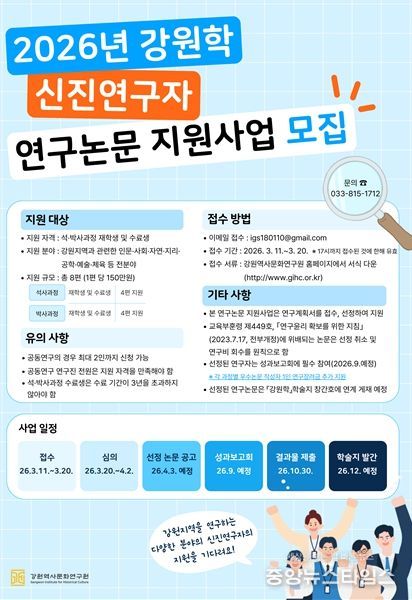 (중앙뉴스타임스 = 방재영 기자) 강원역사문화연구원은 강원학 연구 활성화를 도모하고 강원학 전문 인재 양성을 위해 신진연구자를 대상으로 한 ‘강원학 연구논문 지원사업’을 진행한다.