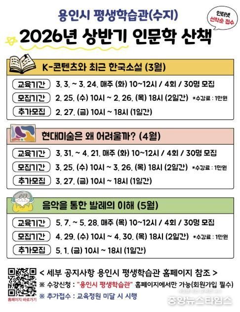 (중앙뉴스타임스 = 방재영 기자) 용인특례시는 오는 25일부터 수지구에 있는 용인시평생학습관에서 인문학 산책 수강생을 모집한다고 13일 밝혔다.