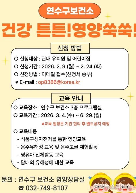 (중앙뉴스타임스 = 방재영 기자) 인천 연수구보건소는 오는 3월부터 지역 내 어린이집과 유치원 원아를 대상으로 올바른 식습관 형성과 건강한 생활 습관 정착을 위해 2026년 ‘건강 튼튼! 영양 쑥쑥! 어린이 교실’을 운영한다고 13일 밝혔다.