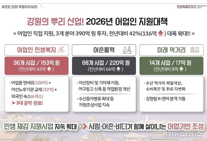 이번 어업인 지원 대책은 어촌 현장의 경영 부담을 완화하고 안정적인 조업 여건을 조성하기 위해 마련된 것으로, 민생복지, 어촌활력 증진, 미래 먹거리 산업 등 3개 분야에 총 390억 원을 투입한다. 이는 전년보다 116억 원(42%) 증가한 규모다.