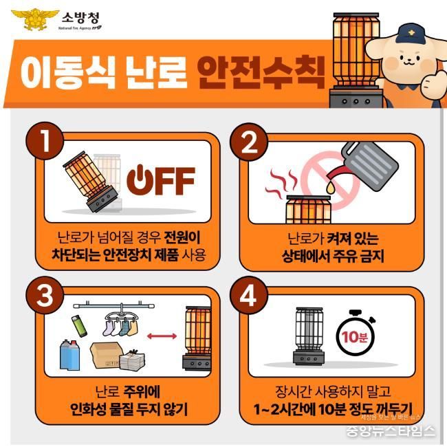 이에 따라 광명소방서는 이동식 난로 화재 예방을 위해 ▲전도 시 전원 차단 등 안전장치가 있는 제품 사용 ▲난로 작동 중 주유 금지 ▲난로 주변 인화성 물질 제거 ▲장시간 사용 시 주기적인 전원 차단 및 환기 등 안전수칙 준수를 당부했다.