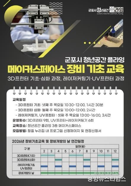 하은호 군포시장은 “이번 교육과 장비개방 프로그램을 통해 청년들이 메이커 장비를 보다 안전하고 실질적으로 활용할 수 있는 환경을 조성하고자 한다”며 “아이디어 구현부터 시제품 제작까지 이어지는 창작 활동의 기반이 되길 기대한다”고 전했다.
