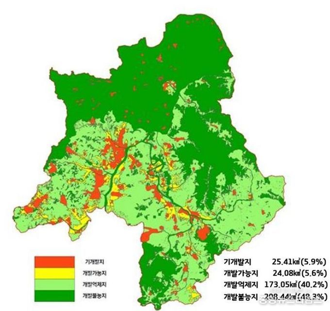 광주시는 시 전역이 특별대책지역과 자연보전권역으로 지정돼 있으며 개발제한구역·상수원보호구역·수변구역·군사시설보호구역 등 각종 중첩 규제를 받고 있다. 전체 면적의 65%가 임야로 구성돼 개발 가용지가 부족한 상황이다. 이에 따라 시는 개발 가용지에 대한 체계적 관리와 양질의 개발 유도를 위한 합리적인 도시관리계획 수립이 필요하다고 설명했다.
