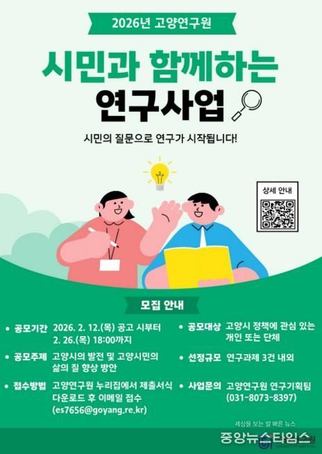 (중앙뉴스타임스 = 방재영 기자) 고양연구원은 시민과 함께 고양시의 미래를 설계하는 문제해결형 연구를 추진하기 위해 ‘시민과 함께하는 연구사업’ 공개 모집을 오는 2월 26일까지 진행한다.