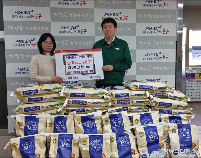 (중앙뉴스타임스 = 방재영 기자) 인천 중구 개항동은 동화기업㈜(채광병 대표)이 설 명절을 앞둔 지난 12일 개항동 관내 저소득 취약계층을 위해 양곡 10kg, 78포를 기탁했다고 밝혔다.