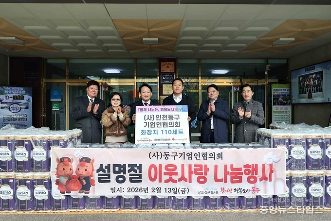 (중앙뉴스타임스 = 방재영 기자) (사)인천동구기업인협의회(회장 장동춘)는 지난 13일 ‘설맞이 사랑의 물품 나눔’ 휴지 110세트 전달식을 개최했다고 밝혔다.