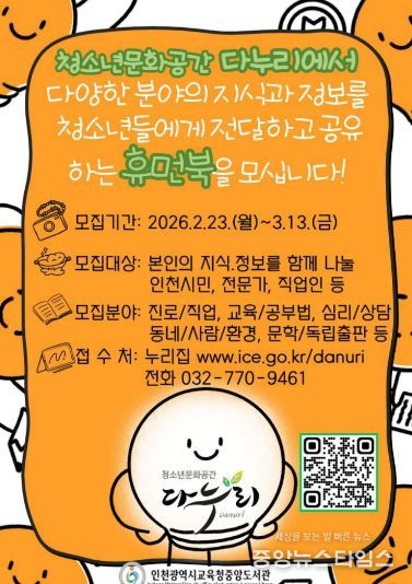 모집은 인천 시민 중 전문 지식이나 독특한 이력을 가진 직업인, 예술가 등을 대상으로 하며, 다누리 누리집에서 2월 23일부터 3월 13일까지 신청할 수 있다.