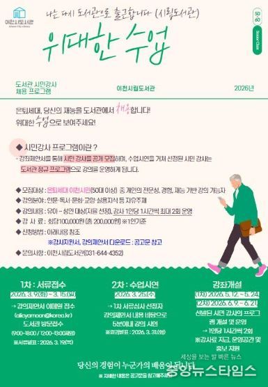 ‘위대한 수업’ 강사 모집은 3월 9일부터 3월 15일까지 진행되며, 우수 강사는 차년도 정규 강좌로 연계 운영할 계획이다. 자세한 내용은 이천시청 누리집 채용공고 또는 이천시 통합도서관 누리집 공지사항에서 해당 공고를 확인할 수 있다.