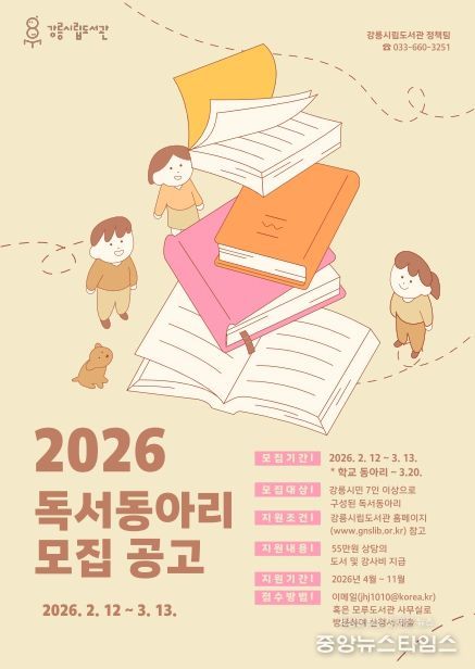 (중앙뉴스타임스 = 방재영 기자) 강릉시립도서관은 지역 내 독서 문화 활성화와 시민 간 문화 교류 증진을 위해 '2026년도 독서동아리 지원사업'을 운영한다고 24일 밝혔다.