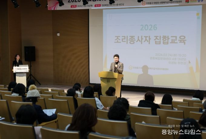 (중앙뉴스타임스 = 방재영 기자) 인천 중구는 지난 24일 영종복합문화센터 대강당에서 ‘2026년도 어린이·사회복지급식관리지원센터 조리종사자 집합교육’을 진행했다.