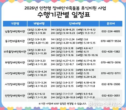 ‘장애인가족돌봄 휴식지원’ 사업은 ▲남동장애인종합복지관▲동구한마음종합복지관▲미추홀장애인종합복지관▲부평장애인종합복지관▲서구장애인종합복지관▲인천시각장애인복지관▲인천장애인종합복지관 7개 기관에서 수행한다.