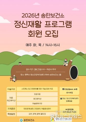 (중앙뉴스타임스 = 방재영 기자) 평택시 정신건강복지센터(송탄보건소)는 만 19세 이상 등록회원을 대상으로 ‘2026년 정신재활 프로그램’을 운영한다고 밝혔다. 이번 프로그램은 정신질환자의 사회적응 능력을 키우고 정신건강 증진을 도모하기 위해 마련됐다.