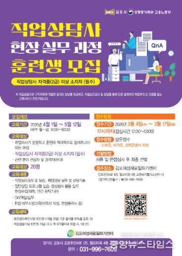 (중앙뉴스타임스 = 방재영 기자) 김포여성새로일하기센터는 고용서비스의 질적 향상과 경력단절 예방을 위해 '직업상담사 현장실무 과정' 훈련생을 모집한다.