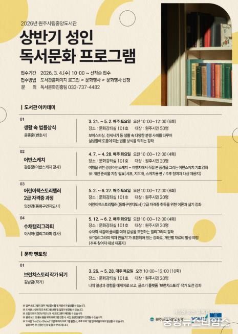 (중앙뉴스타임스 = 방재영 기자) 원주시립중앙도서관은 3월 21일부터 ‘2026년 상반기 성인 독서문화 프로그램’을 운영한다.