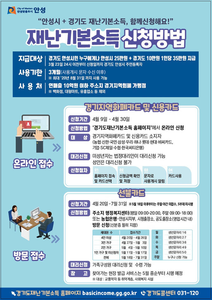재난기본소득은 지역화폐와 신용카드, 선불카드 등 모두 3가지 형태로 지급받을 수 있으며 ‘경기도 재난기본소득신청 홈페이지’를 통해, 4월 9일부터 30일까지 지역화폐와 신용카드 접수가 먼저 시작된다.