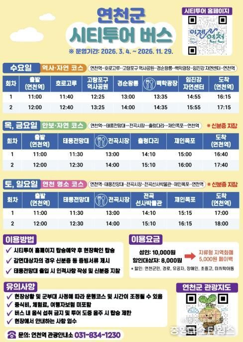 (중앙뉴스타임스 = 방재영 기자) 연천군이 오는 3월 4일부터 ‘2026년 연천 시티투어 버스’를 재운행한다. 운영 기간은 11월 29일까지다.