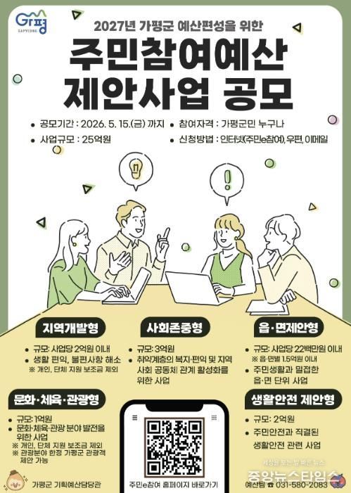 (중앙뉴스타임스 = 방재영 기자) 가평군은 2027년도 예산에 반영할 주민참여예산 제안사업 공모를 3일부터 오는 5월 15일까지 실시한다.