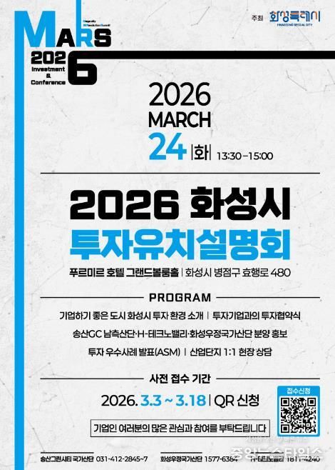 (중앙뉴스타임스 = 방재영 기자) 화성특례시가 오는 24일 푸르미르 호텔에서 ‘2026 화성특례시 투자유치 설명회’를 개최하고, 3일부터 18일까지 QR코드를 통한 사전접수를 진행한다.