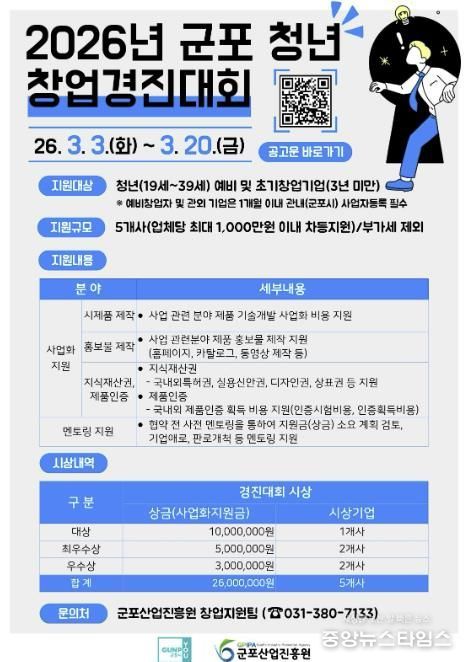 (중앙뉴스타임스 = 방재영 기자) 군포산업진흥원은 지역 내 유망 청년 창업가를 발굴하고 혁신 아이디어의 성공적인 사업화를 지원하기 위해 2026년 군포 청년 창업경진대회 지원사업 참가자를 2026년 3월 3일부터 3월 20일까지 모집한다고 밝혔다.