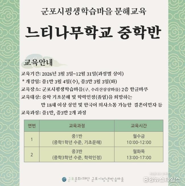(중앙뉴스타임스 = 방재영 기자) 군포문화재단 군포시평생학습마을은 지난 3일 성인 문해교육 프로그램 ‘느티나무학교’를 개강했다고 밝혔다.
