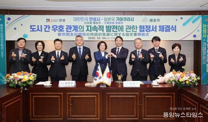 (중앙뉴스타임스 = 방재영 기자) 안성시는 2026년 3월 4일 오전 11시 안성시청 본관 2층 상황실에서 일본 가나가와현 가마쿠라시(시장 마쓰오 다카시)와 '도시 간 우호 관계의 지속적 발전에 대한 협정'을 체결하고 양 도시 간 문화·예술 및 청소년 분야 교류를 본격 추진하기로 했다.