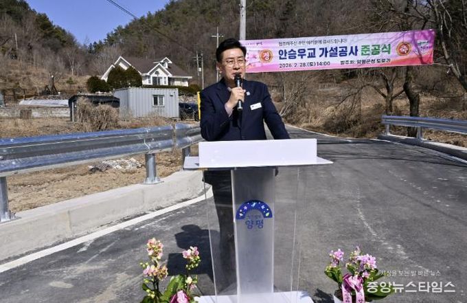 안승우교는 시설 노후화로 구조적 안전성이 낮아 사고 위험이 제기돼 왔으며, 협소한 교량 폭으로 인해 주민들이 통행에 불편을 겪어왔다. 이에 군은 주민 안전 확보를 위해 총사업비 3억 9천만 원을 투입해 기존 교량을 전면 철거하고, 연장 12.43m, 폭 5.8~8.8m 규모의 교량으로 새롭게 가설했다. 이번 재가설을 통해 대형 차량의 원활한 통행은 물론, 주민들의 생활 편의도 크게 개선될 것으로 기대된다.