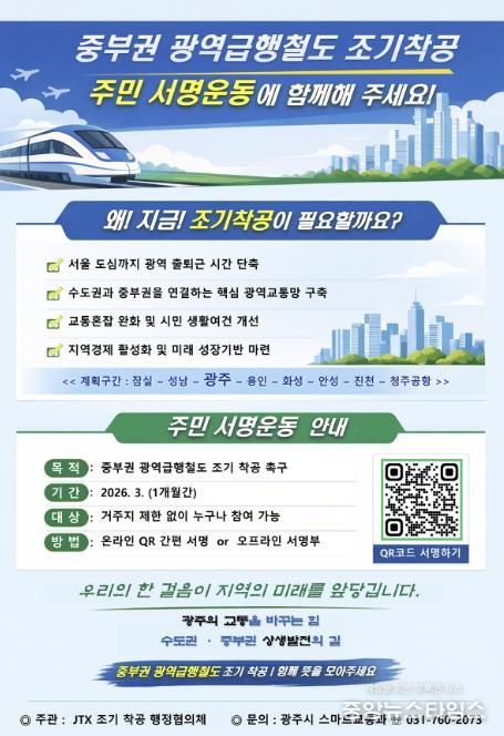 (중앙뉴스타임스 = 방재영 기자) 광주시는 중부권 광역급행철도의 조기 착공을 촉구하기 위해 3월 한 달간 주민 서명운동을 한다고 6일 밝혔다.