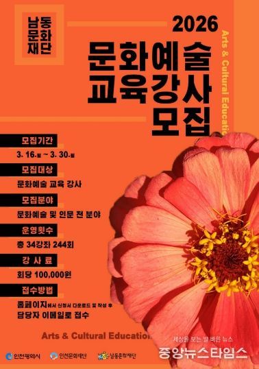 (중앙뉴스타임스 = 방재영 기자) 인천문화재단과 남동문화재단이 ‘2026년 문화예술 교육 사업’ 추진을 위한 문화예술 교육 강사를 공개 모집한다고 6일 밝혔다.