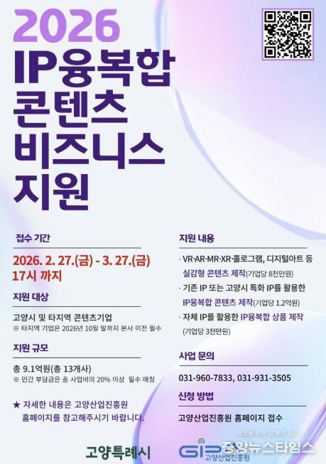 (중앙뉴스타임스 = 방재영 기자) 고양특례시와 고양산업진흥원이 오는 3월 27일까지 ‘IP융복합 콘텐츠 비즈니스 지원사업’에 참여할 기업을 모집한다.