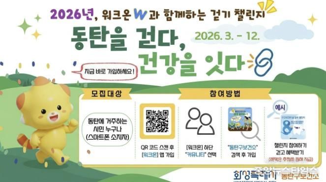 이번 사업은 모바일 걷기 앱 ‘워크온(WalkON)’을 활용해 진행된다. 스마트폰을 사용하는 동탄구 주민이라면 누구나 무료로 참여할 수 있으며, 앱 설치 후 ‘동탄구보건소 공식 커뮤니티’에 가입하면 다양한 걷기 챌린지에 참여할 수 있다.