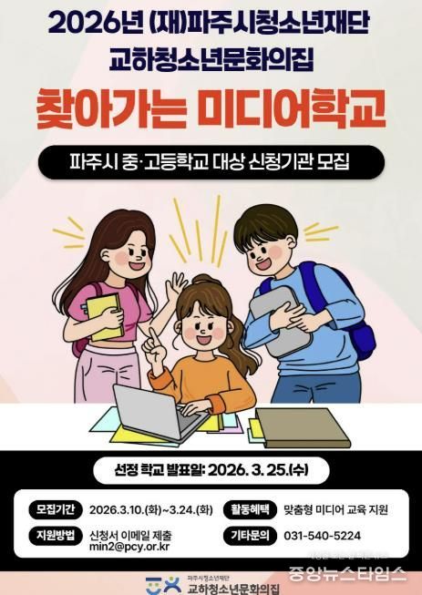 (중앙뉴스타임스 = 방재영 기자) (재)파주시청소년재단 교하청소년문화의집은 파주시 청소년의 미디어 이해력 향상과 디지털 역량 강화를 위해 ‘2026년 찾아가는 미디어학교’ 프로그램에 참여할 중·고등학교를 모집한다고 밝혔다.