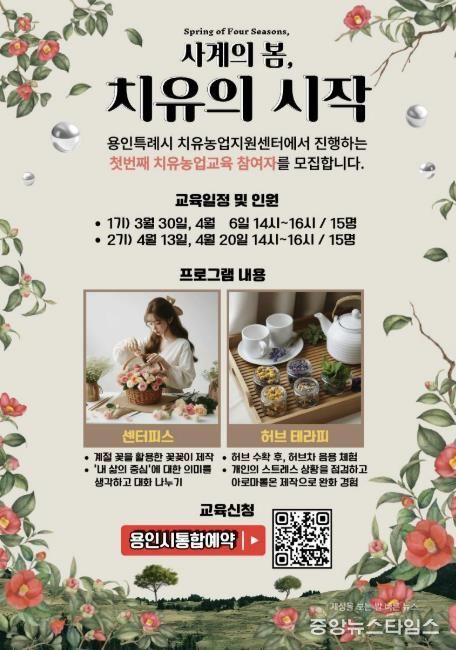 (중앙뉴스타임스 = 방재영 기자) 용인시 농업기술센터는 치유농업지원센터에서 오는 20일부터 4월 20일까지 치유농업 프로그램 ‘사계의 봄(Spring of Four Seasons), 치유의 시작’을 운영한다고 11일 밝혔다.