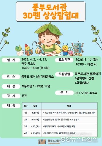(중앙뉴스타임스 = 이광운 기자) 김포시 풍무도서관은 초등학생 1~3학년을 대상으로 ‘3차원 펜 상상탐험대’를 오는 4월 2일부터 4월 23일까지 매주 목요일 오후 4시부터 6시까지 총 4회에 걸쳐 운영한다.