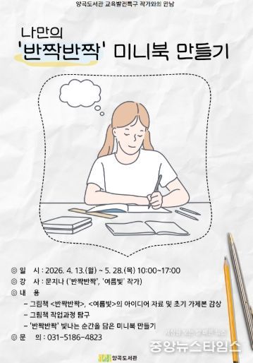(중앙뉴스타임스 = 이광운 기자) 김포시 양곡도서관은 2026년 교육발전특구 사업의 일환으로 4월 13일부터 5월 28일까지 관내 초등학생을 위한 스트레스 관리 프로그램 '나만의 ‘반짝반짝’ 미니북 만들기'를 운영한다.
