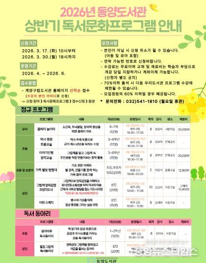 수강 신청 기간은 3월 17일 오전 10시부터 3월 30일 오후 6시까지이며, 계양구립도서관 누리집을' 통해 선착순으로 접수한다. 보다 자세한 사항은 누리집 내 독서문화프로그램 안내를 참고하거나, 동양도서관 아동자료실로 문의하면 된다.