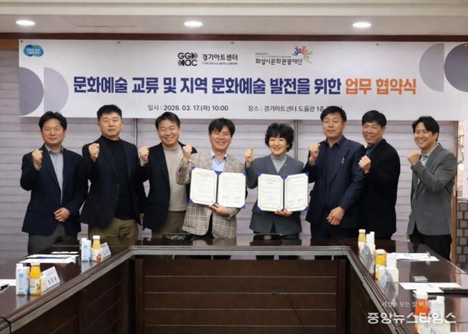(중앙뉴스타임스 = 이광운 기자) 화성시문화관광재단은 3월 17일 경기아트센터에서 경기 아트센터와 문화예술 교류 및 협력 강화를 위한 업무협약(MOU)을 체결했다. 이번 협약은 양 기관이 문화예술 분야에서 상호 협력을 강화하고 지역 문화예술 발전과 시민들의 문화 향유 기회 확대를 위해 추진됐다. 양 기관은 상호 협력을 바탕으로 공연과 문화예술 프로그램을 공동 기획하고 다양한 문화예술 콘텐츠 교류를 통해 지역 문화예술 활성화를 도모할 계획이다.